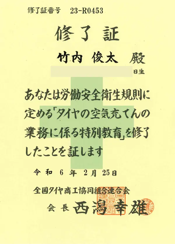 タイヤ空気充てん作業特別教育修了