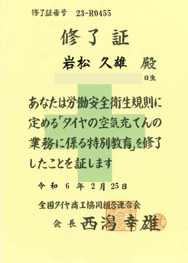 ※当社はタイヤ空気充てん作業特別教育修了工場です。